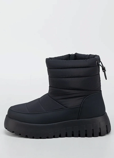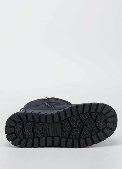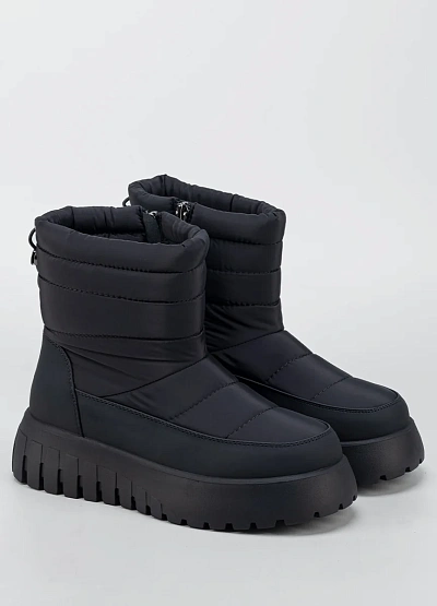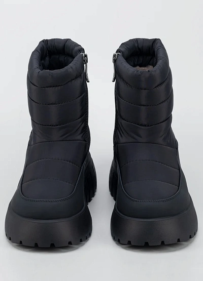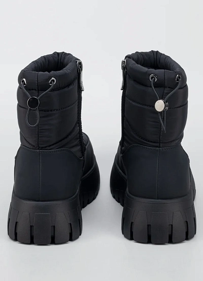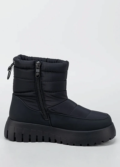 Женские утеплённые зимние ботинки в универсальном чёрном цвете — практичное решение для холодного и снежного сезона. Модель выполнена в лаконичном современном дизайне с комбинированным верхом из гладкого материала и стёганого текстиля, что обеспечивает защиту от влаги и ветра. Высокая массивная подошва с выраженным протектором гарантирует устойчивость на скользких поверхностях, а мягкий верхний край и удобная застёжка на молнии облегчают процесс надевания и повышают комфорт при носке.