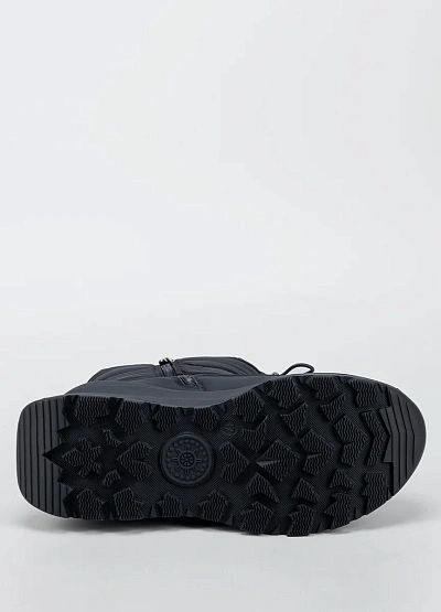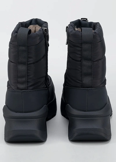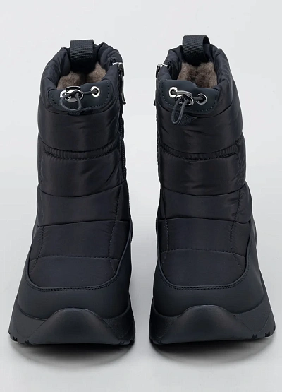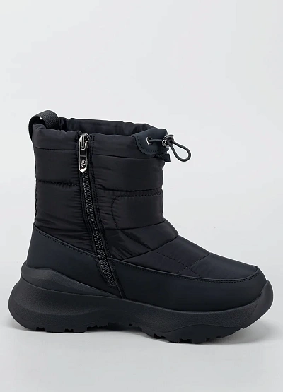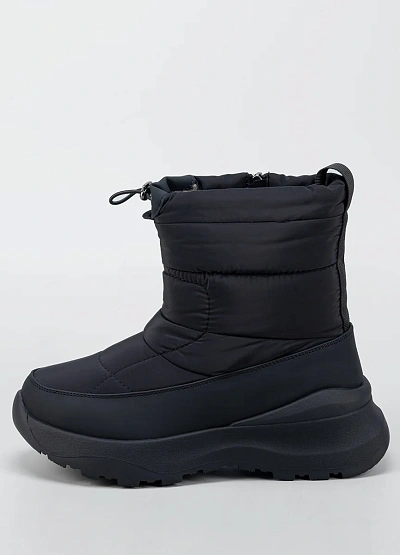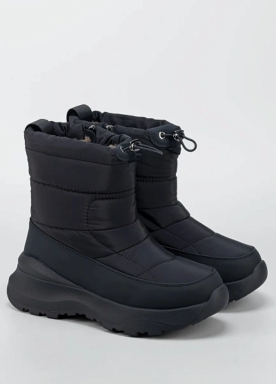 Женские зимние дутики в минималистичном чёрном исполнении — удобная и практичная модель для холодного сезона. Верх выполнен из плотного влагостойкого текстиля с утеплённой стёганой частью, которая хорошо сохраняет тепло и защищает от ветра. Утягивающий шнур по верхнему краю помогает регулировать посадку и дополнительно препятствует попаданию снега внутрь. Объёмная подошва с мягкой амортизацией и рельефным протектором обеспечивает комфорт при ходьбе и устойчивость на скользких покрытиях.