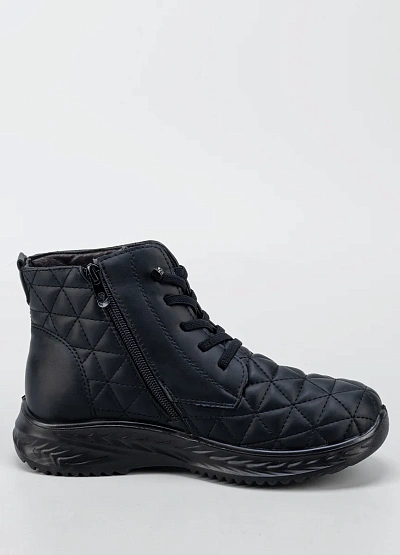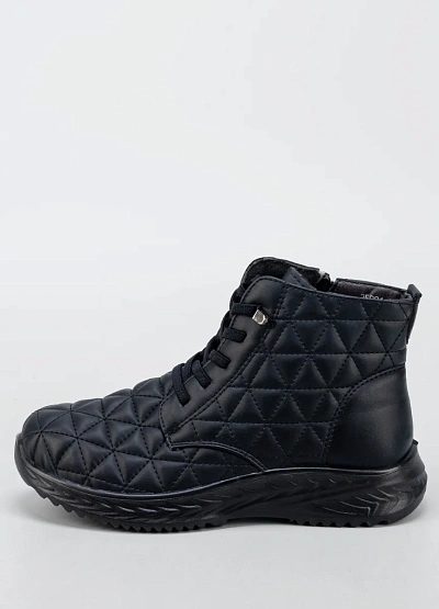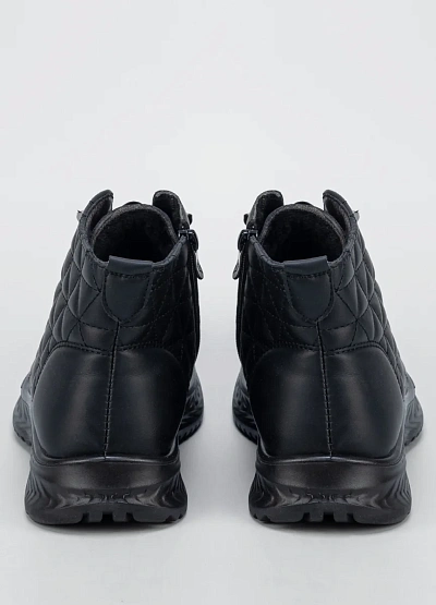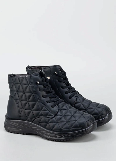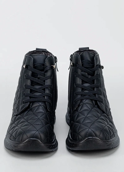 Женские зимние ботинки в практичном повседневном стиле, выполненные в универсальном чёрном цвете. Модель сочетает комфорт спортивной обуви и аккуратный городской дизайн. Стёганый верх придаёт ботинкам современный вид, а высокая посадка обеспечивает дополнительную защиту от холода и ветра. Устойчивая подошва с выраженным протектором делает обувь удобной для зимних прогулок и активного ритма города.