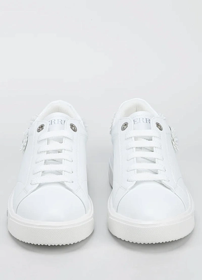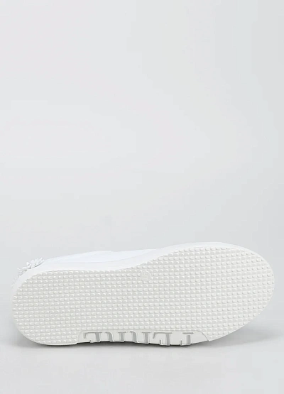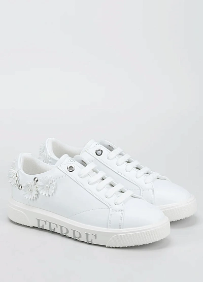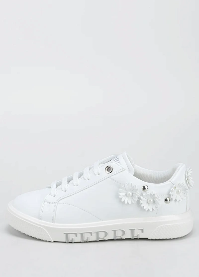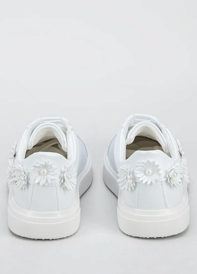 Женская обувь, выполненная в виде классических кед, представлена в белой цветовой гамме. Модель выделяется объемным декором в виде цветков на боковой части и контрастной надписью на подошве.