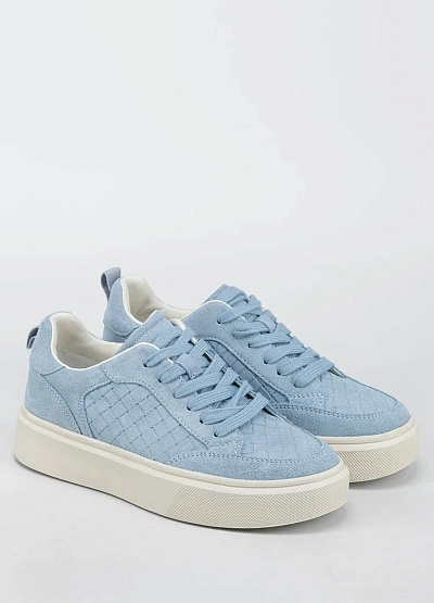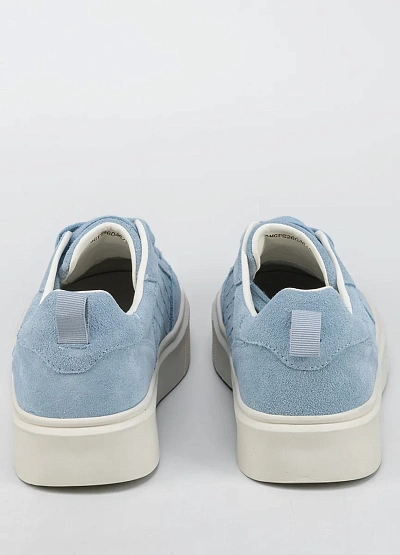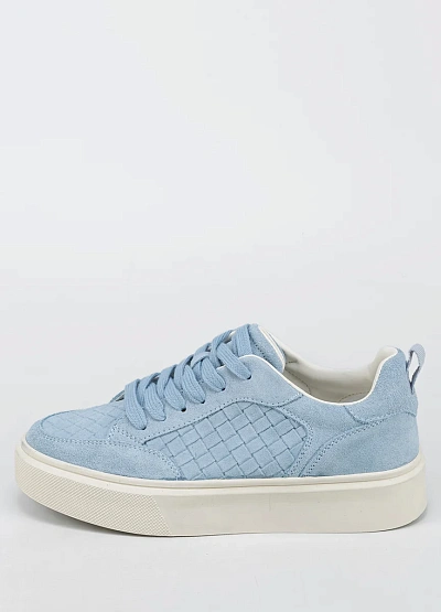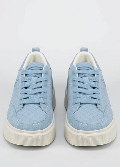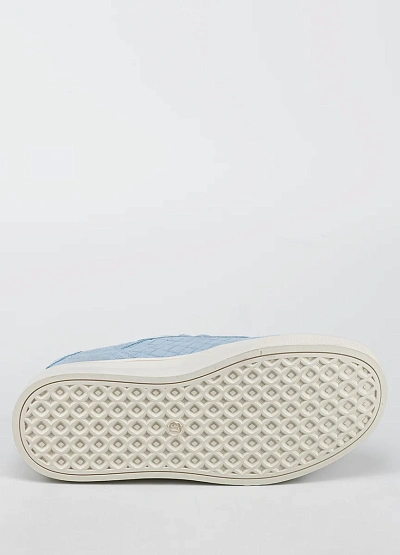 Женские кеды светло-голубого цвета с контрастной белой подошвой выполнены в современном стиле. Модель отличается утолщённой подошвой и минималистичным переплетением на боковых панелях.