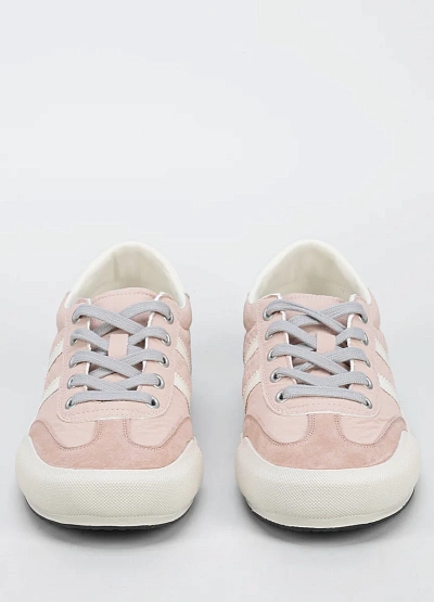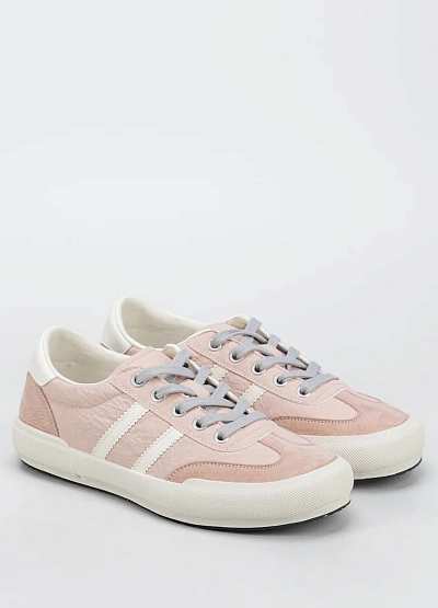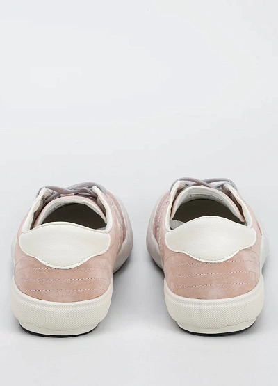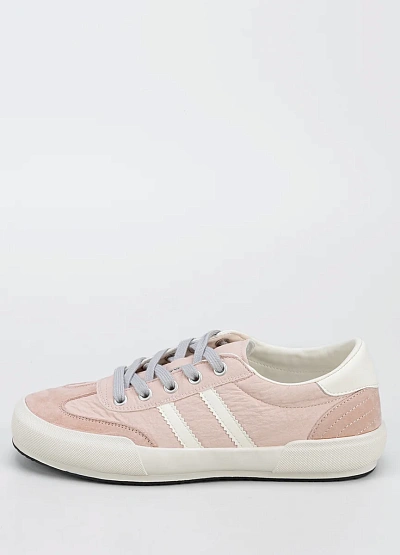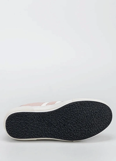 Женские кеды светло-розового цвета с белыми и серыми акцентами. Модель выполнена в классическом спортивном стиле, с контрастными полосками по бокам и массивной, рифлёной подошвой. Дизайн дополнен светло-серыми шнурками.