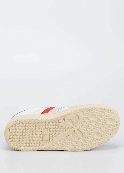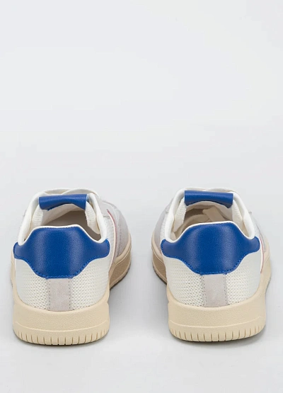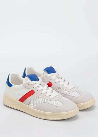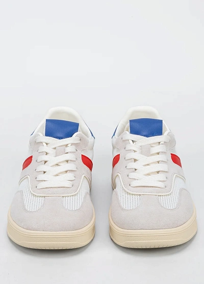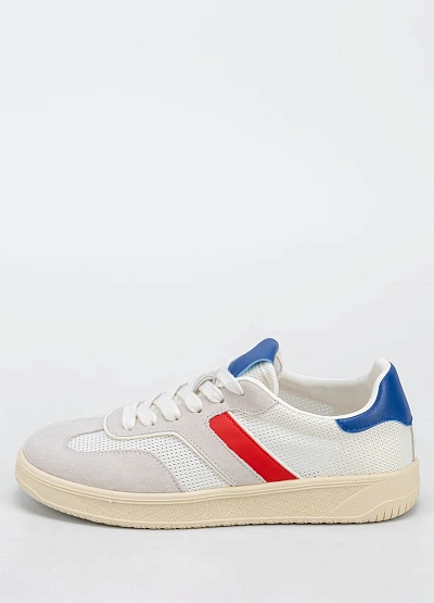 Женские кеды выполнены в светлой цветовой гамме с акцентами синего и красного оттенков. Модель имеет скруглённый носок, контрастные элементы на боковой части и шнуровку. Верх изделия сочетает разные текстуры для современного внешнего вида.