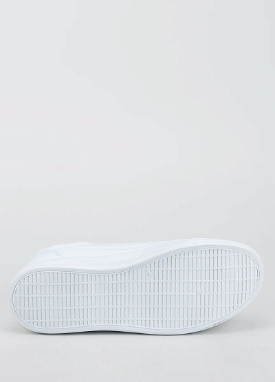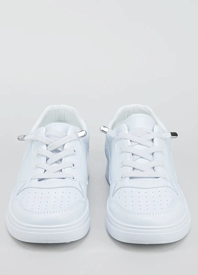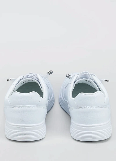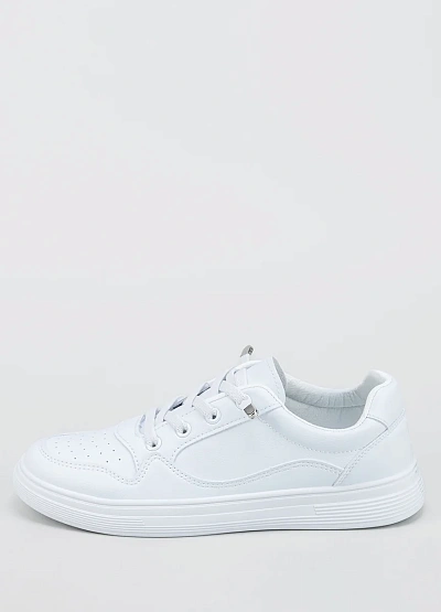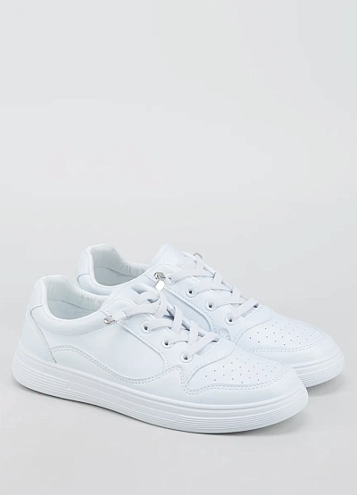 Женские кеды классического типа выполнены в однотонной белой цветовой гамме. Модель с низким верхом на шнуровке, имеет простую и лаконичную отделку. Дизайн отличается универсальностью и отсутствием ярких декоративных элементов.