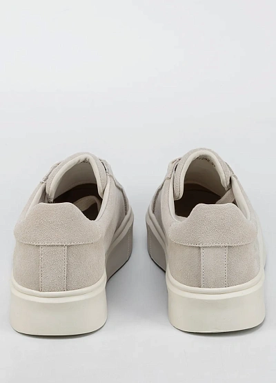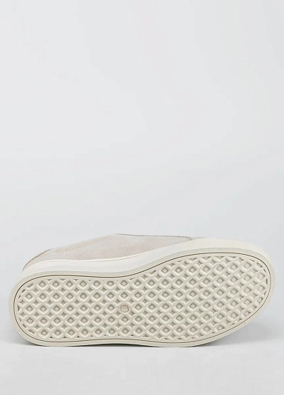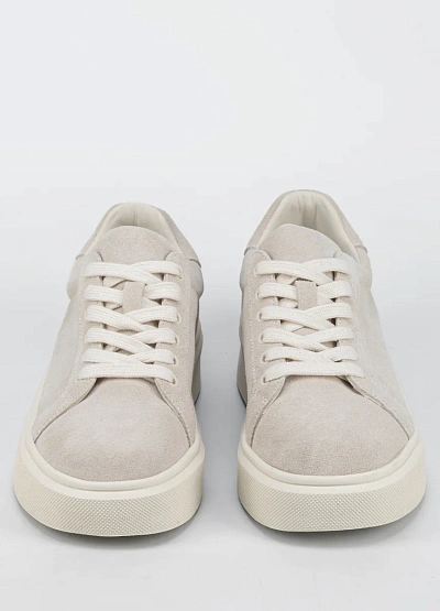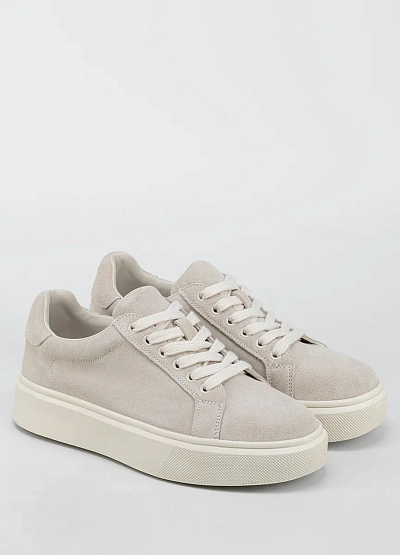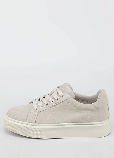 Женские кеды нейтральной светло-бежевой гаммы выполнены в лаконичном стиле. Модель низкая, с классической шнуровкой и однотонным верхом, отличается утолщённой подошвой и аккуратным силуэтом.