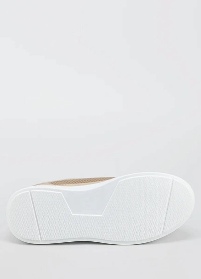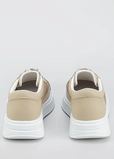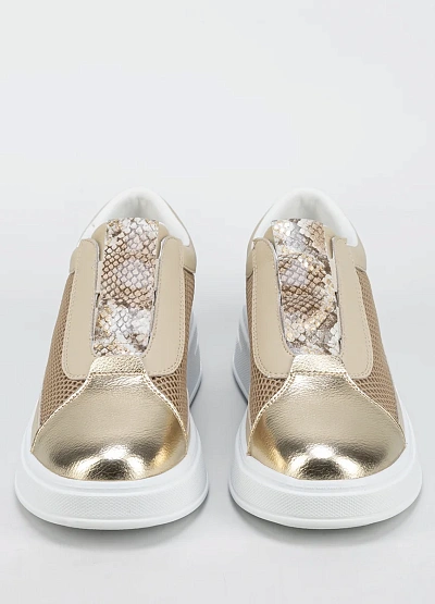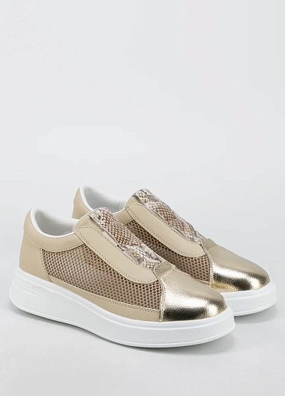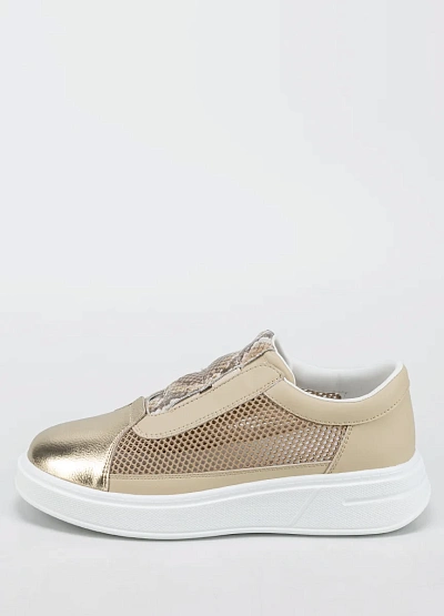 Женские кеды нейтральных бежевых и золотистых оттенков с контрастной белой подошвой. Модель выделяется сетчатыми вставками по бокам и блестящим носком. Детали дизайна придают обуви современный и легкий вид.