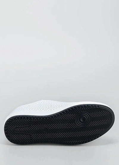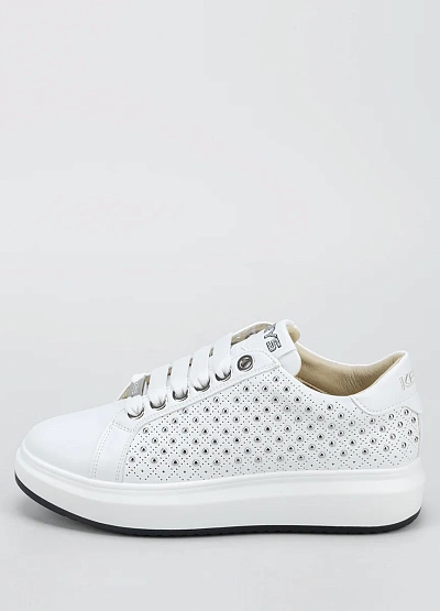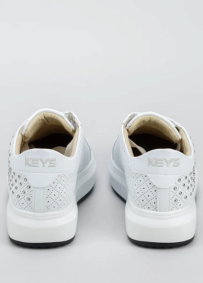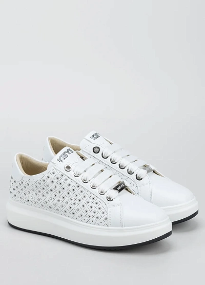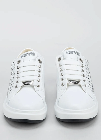 Женские кеды белого цвета с однотонной цветовой гаммой. Модель выполнена с перфорацией по бокам и металлическими вставками, имеет классическую шнуровку и утолщённую подошву.