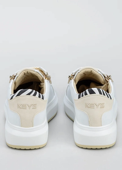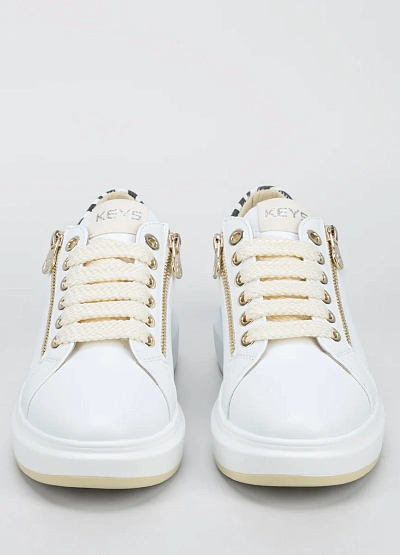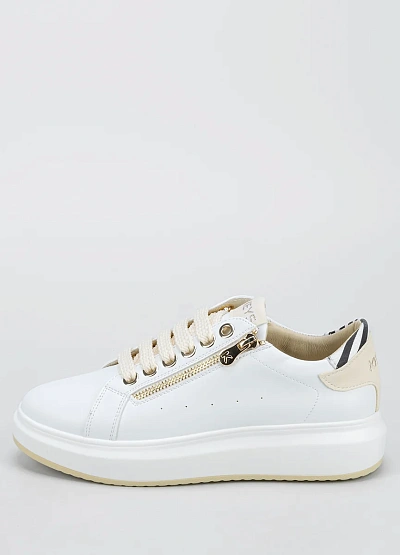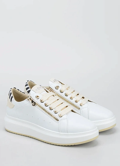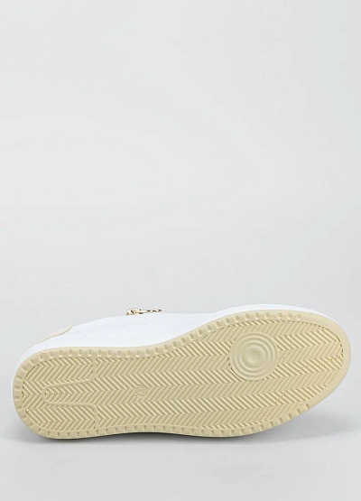 Женские кеды выполнены в белой цветовой гамме с кремовыми и бежевыми акцентами. Модель отличается классическим силуэтом, декоративной молнией сбоку и деталями на пятке с полосатым узором. Широкая подошва и золотистая фурнитура создают стильный акцент.