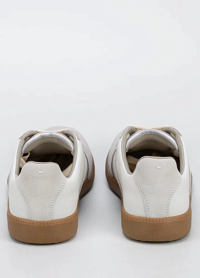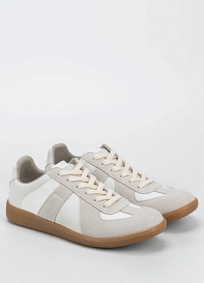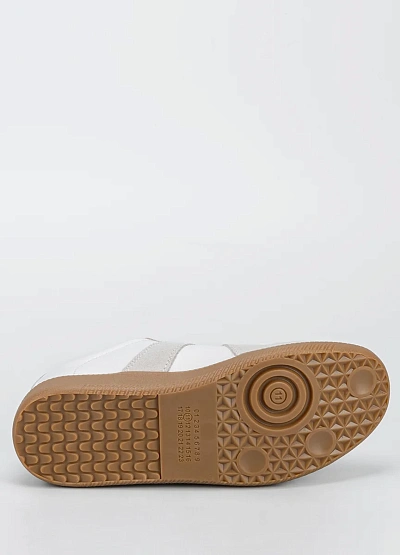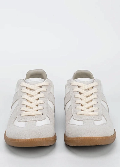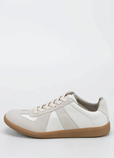 Универсальные женские кеды выполнены в светлой цветовой гамме с сочетанием белого и бежевого оттенков. На модели видны замшевые вставки и контрастная коричневая подошва, классическая шнуровка спереди.