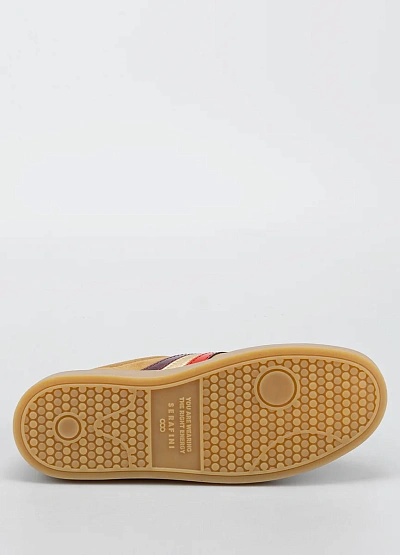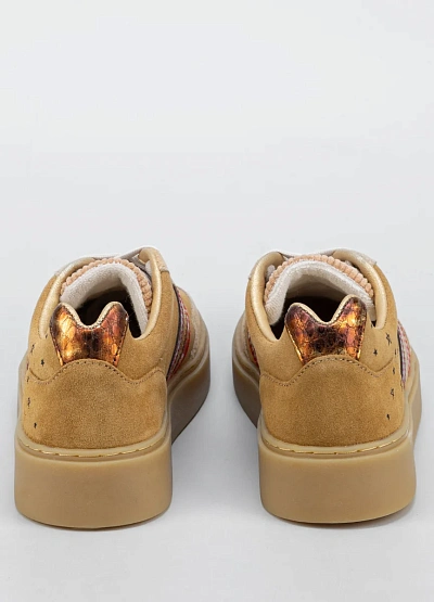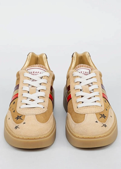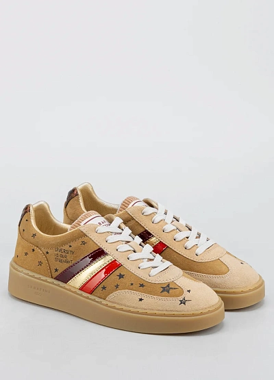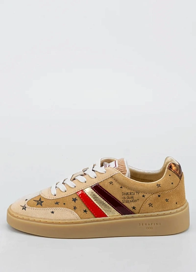 Женские кеды нейтрального бежевого оттенка с элементами золотистого, бордового и красного цвета. Модель украшена принтом в виде звёзд и надписью на внешней части, а также контрастными полосами по бокам и белой шнуровкой.