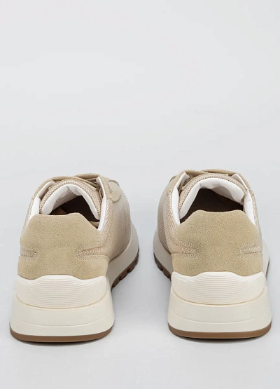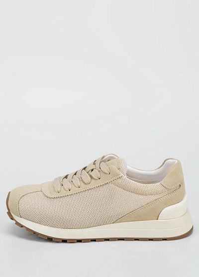Универсальные женские кроссовки светло-бежевой цветовой гаммы с классической шнуровкой. Модель выполнена в минималистичном стиле, с комбинированной вставкой из сетчатого материала и гладкими элементами. Отличается лаконичным дизайном и сдержанными оттенками.