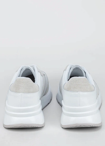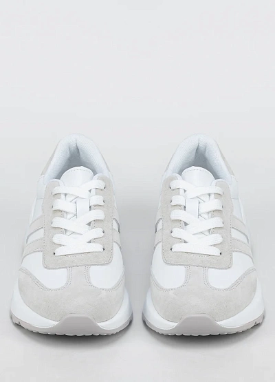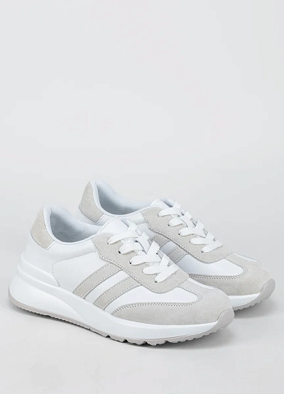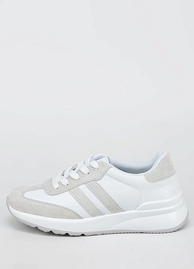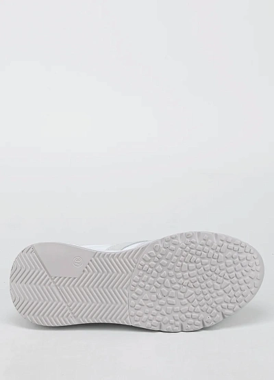 Женские кроссовки в светлой цветовой гамме. Выполнены в сочетании белого и светло-серого цветов, с классической шнуровкой и контрастными вставками по бокам. Модель отличается минималистичным дизайном и рельефной подошвой.