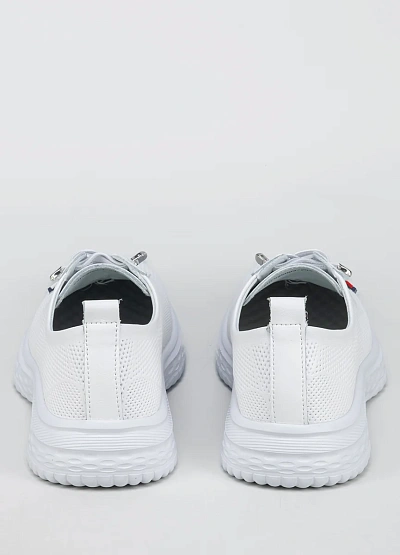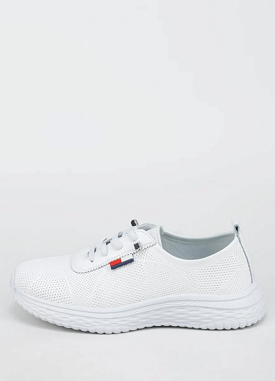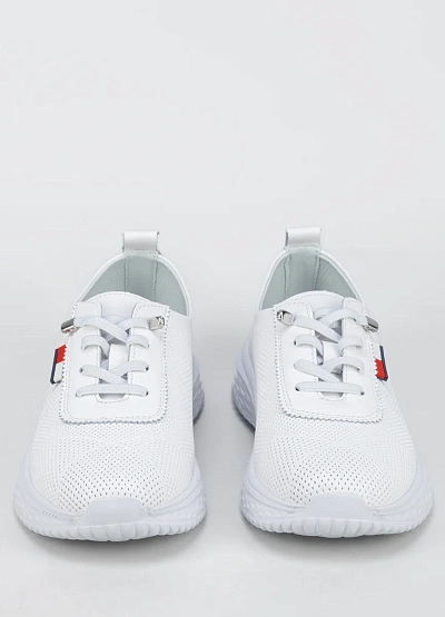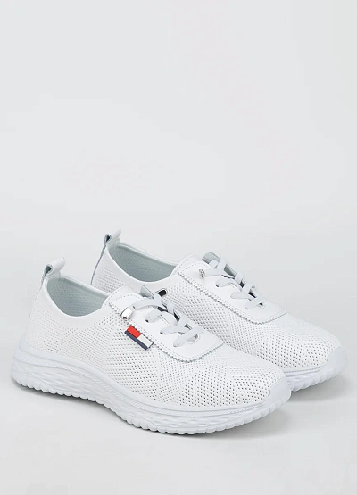 Женские кроссовки в белой цветовой гамме с перфорацией по всему верху. Модель имеет классическую шнуровку и небольшую вставку с цветным элементом сбоку, что добавляет акцент в дизайне. Подошва выполнена с выраженным рельефом.