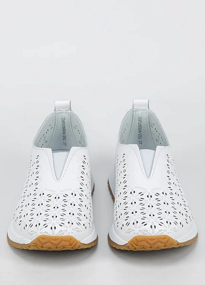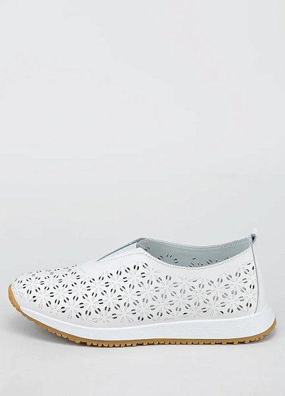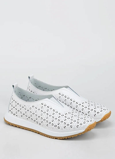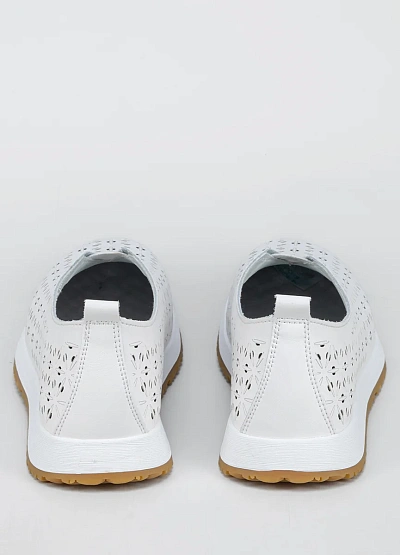 Женская кроссовки закрытого типа выполнена в светлой цветовой гамме с преобладанием белого оттенка. Модель отличается перфорацией с цветочным узором по всей поверхности и удобной низкой подошвой.