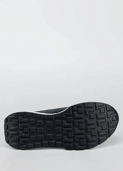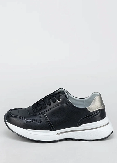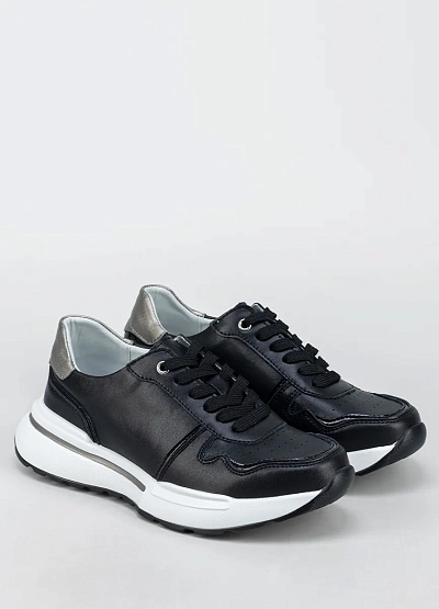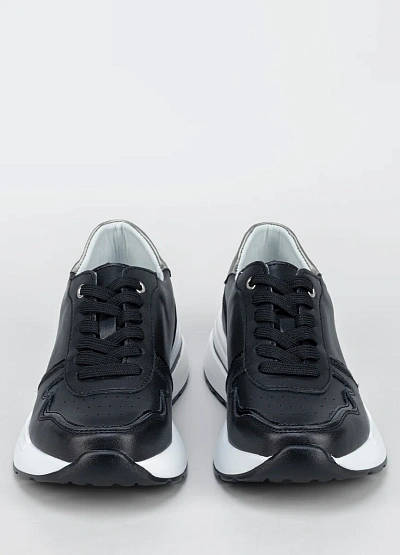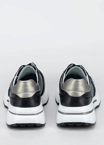 Стильные женские кроссовки выполнены в черно-бело-серой гамме. Модель отличается объемной белой подошвой и вставкой серебристого цвета на заднике. На фото видна классическая шнуровка и массивный силуэт.