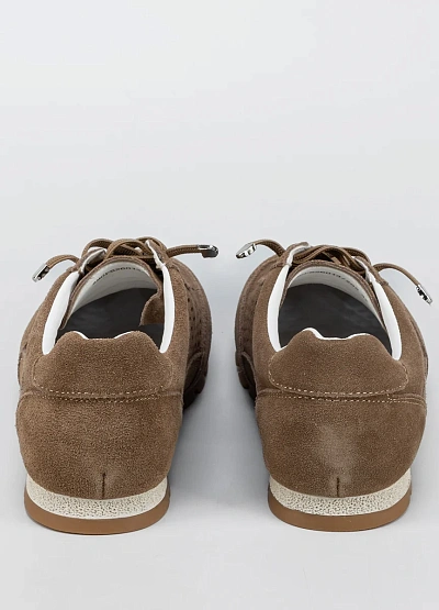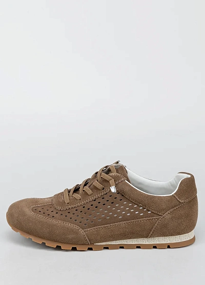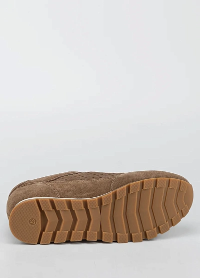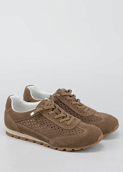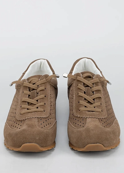 Женские кроссовки спортивного типа в коричневой цветовой гамме. Модель выполнена с перфорацией по бокам, низким силуэтом и шнуровкой. Подошва рельефная, оттенок подошвы светло-коричневый.
