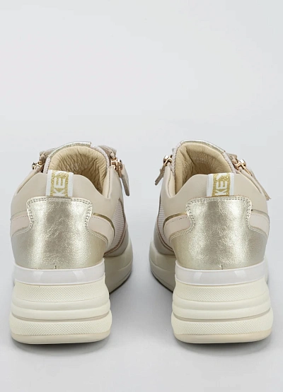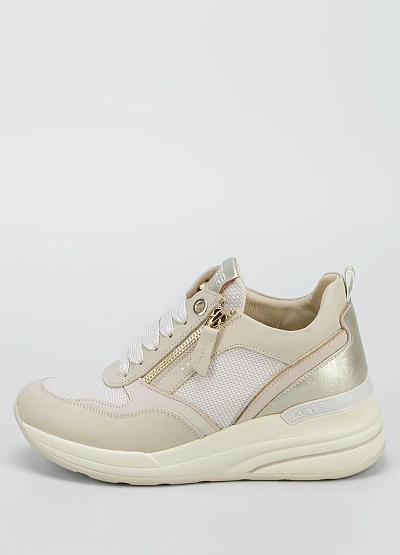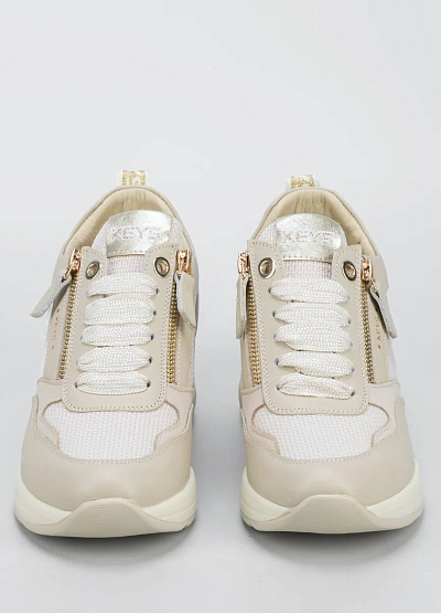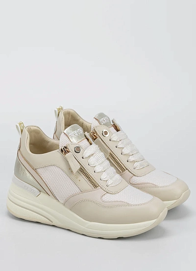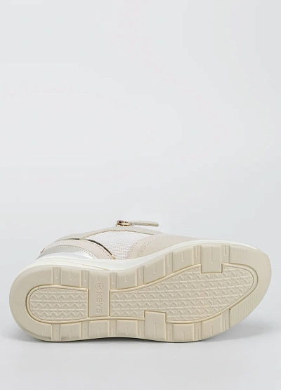 Женские кроссовки в светлой цветовой гамме выполнены в сочетании белого, бежевого и золотистого оттенков. Модель отличается утолщенной подошвой и декоративной молнией сбоку, а также комбинированной текстурой материала.