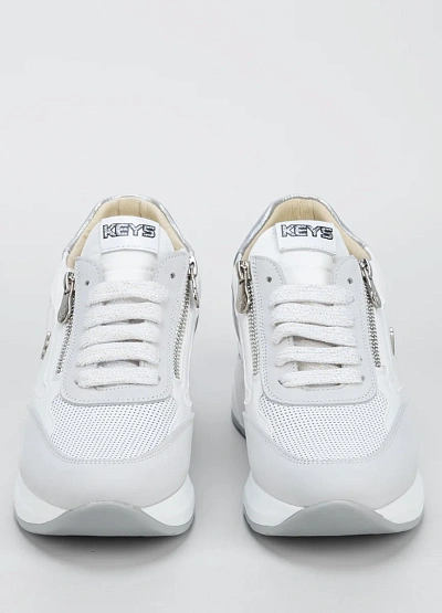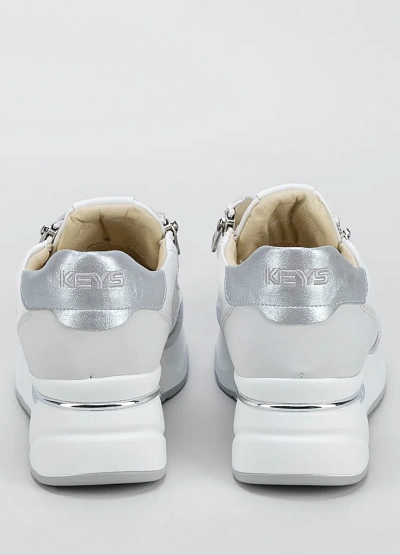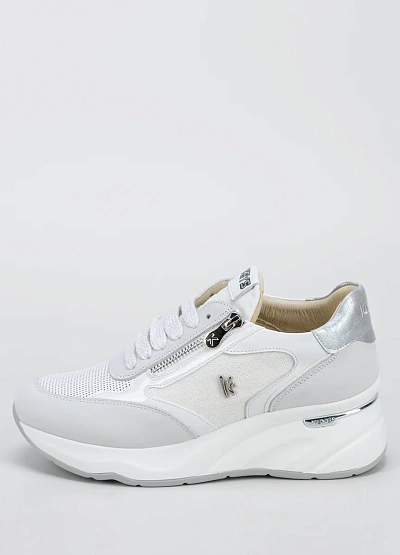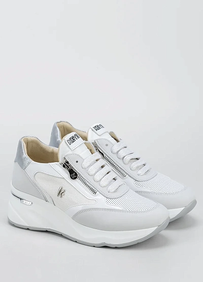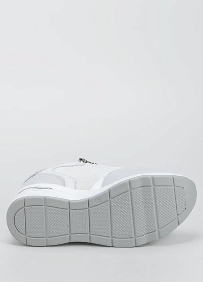 Женские кроссовки в бело-серой цветовой гамме с серебристыми элементами. Модель выполнена на толстой платформе, с комбинированными деталями и боковой молнией для удобства. Лаконичный дизайн с декоративными вставками делает обувь универсальной для разных стилевых решений.