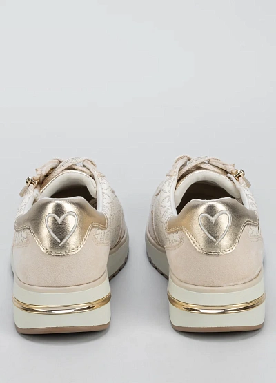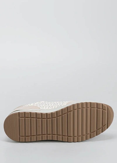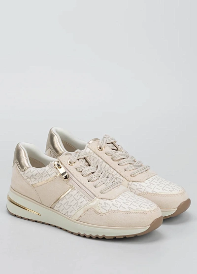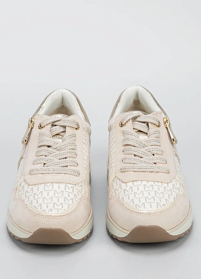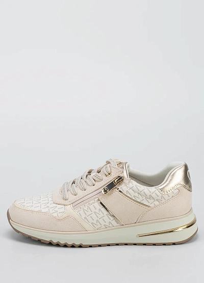 Женские кроссовки светлой цветовой гаммы с комбинированным дизайном. Модель выполнена в бежевых тонах с металлизированными акцентами и декоративной молнией сбоку. Отличается низким профилем и плотной подошвой.