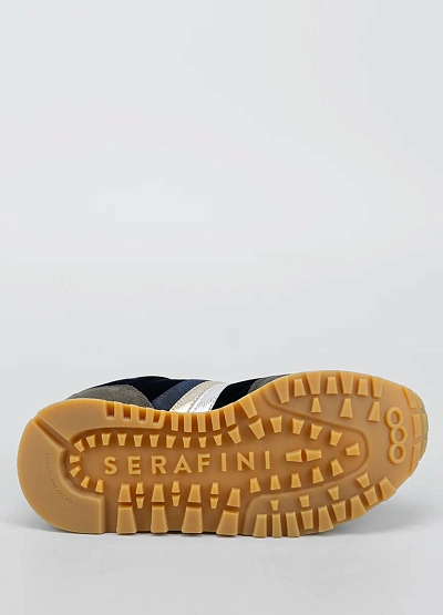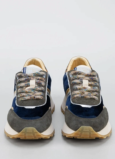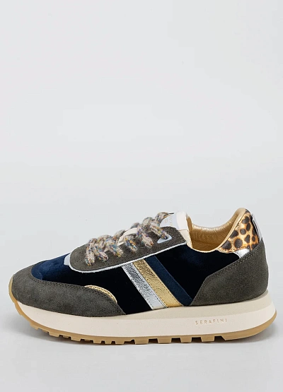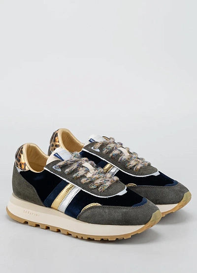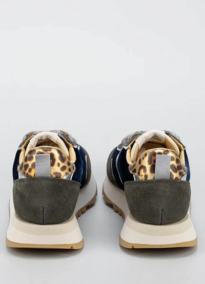 Женские кроссовки в насыщенной цветовой гамме включают тёмно-синий, серый, золотой и бежевый оттенки. Модель выделяется комбинированным верхом с контрастными полосами и необычными деталями, такими как разноцветные шнурки и леопардовый акцент на пятке.