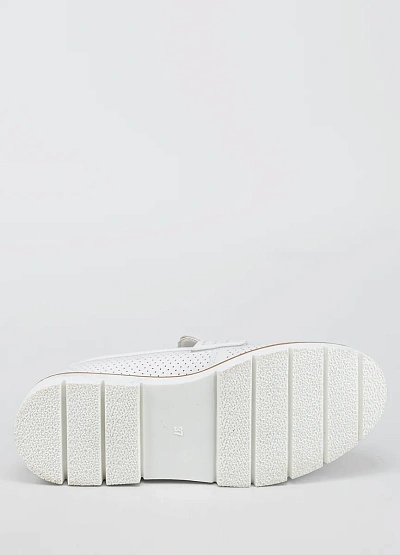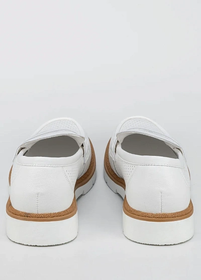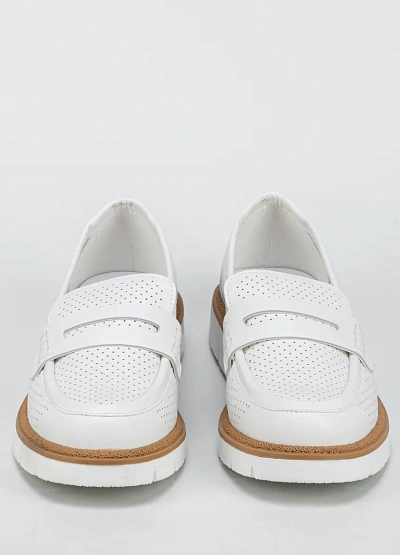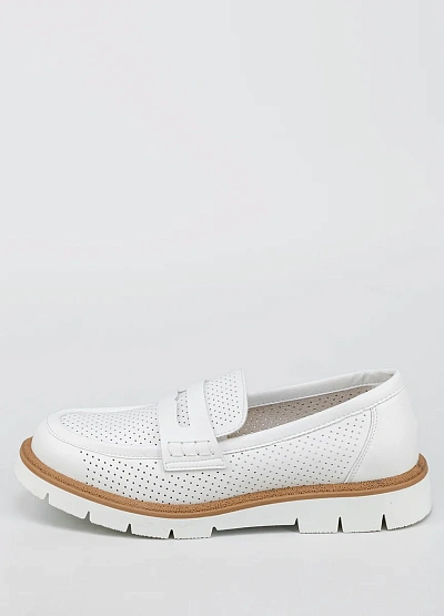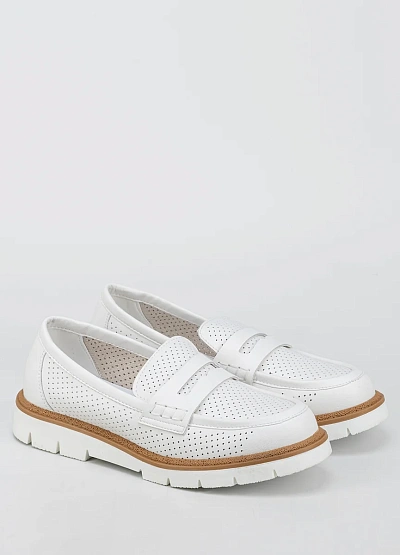 Женские лоферы белого цвета с контрастной подошвой выполнены в лаконичном стиле. Модель отличается перфорированным верхом и объёмной подошвой, что придаёт обуви современный вид.