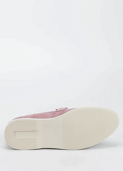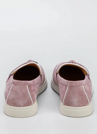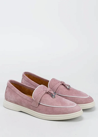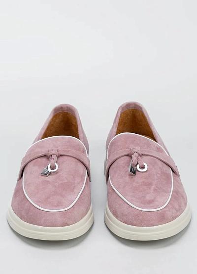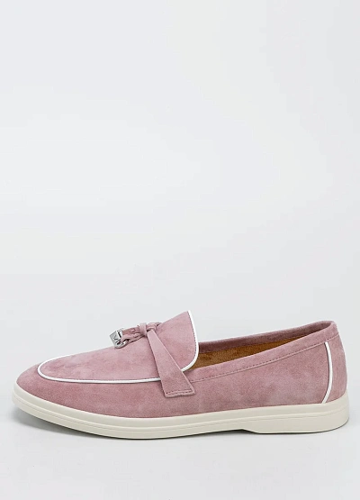 Женские лоферы выполнены в нежной розово-пудровой гамме с контрастной белой окантовкой. Модель имеет классическую форму с округлым мысом и декоративной деталью на подъёме. Обувь выглядит лаконично и универсально благодаря приглушённому цвету и минималистичному дизайну.