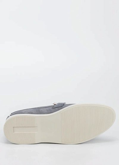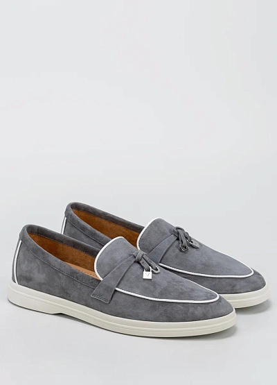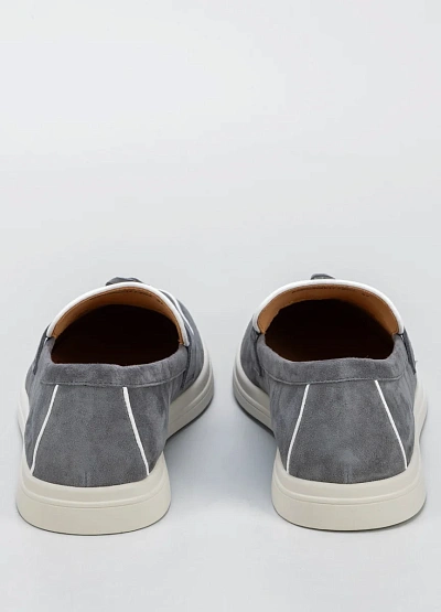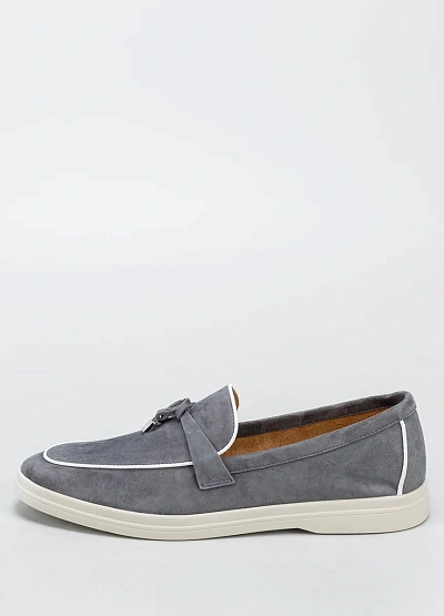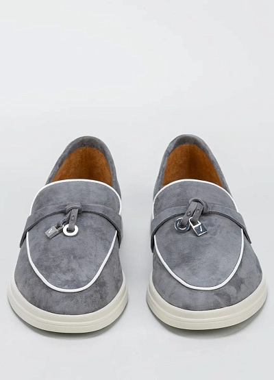 Женские лоферы выполнены в серой цветовой гамме с контрастной белой подошвой и белой окантовкой. Модель отличается лаконичным дизайном с декоративным элементом на подъеме, что придает обуви аккуратный и элегантный вид.