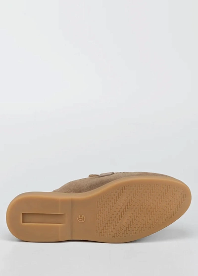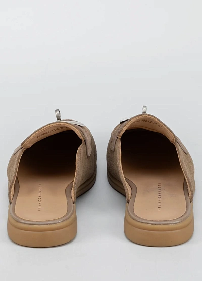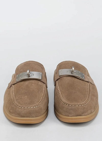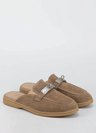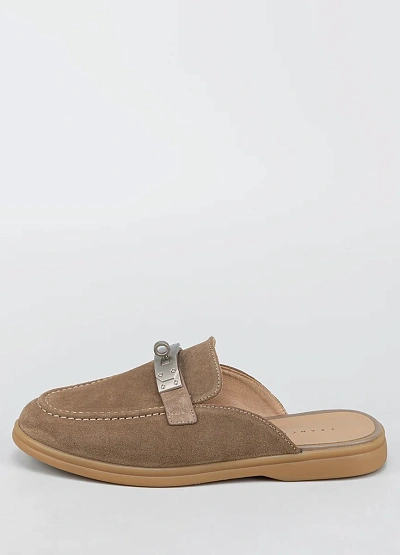 Женские мюли открытого типа выполнена в спокойной бежево-коричневой гамме, представленная в виде мюлей с декоративным металлическим элементом на верхней части. Модель выполнена с открытой пяткой и контрастной подошвой, обеспечивающей комфорт при ходьбе.