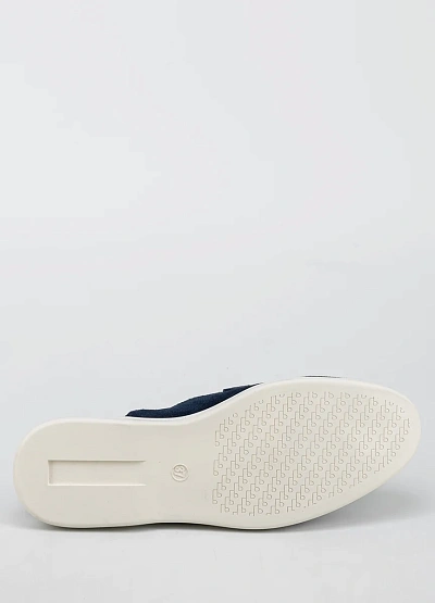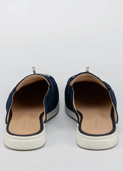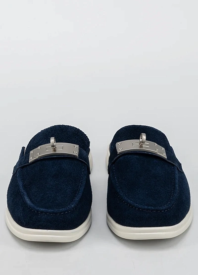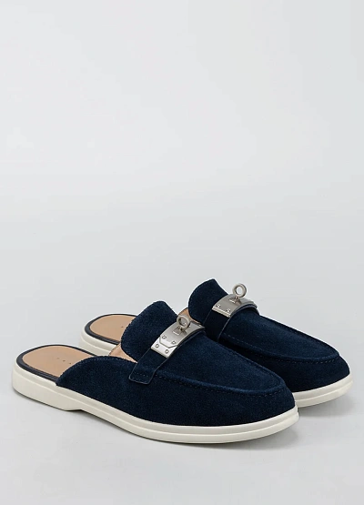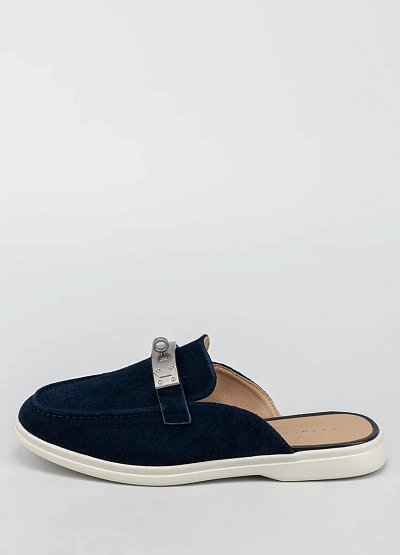 Женские мюли открытого типа в формате мюли темно-синего цвета. Модель выполнена в глубокой синей гамме с контрастной белой подошвой и металлической декоративной деталью на верхней части. Обувь имеет открытую пятку и аккуратный силуэт.