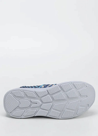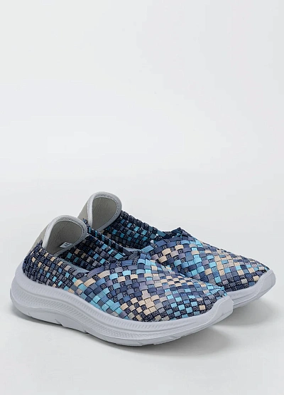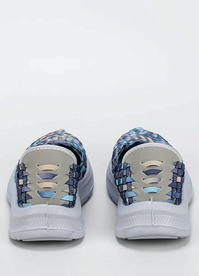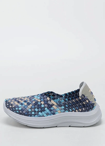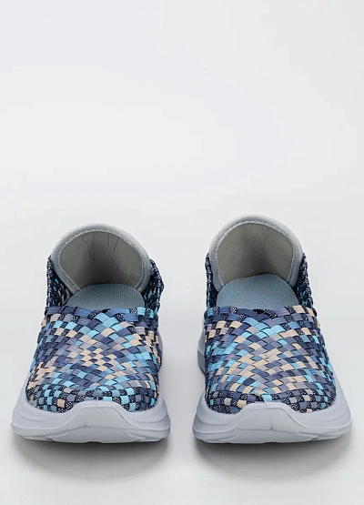 Женские слипоны, выполнены в синей цветовой гамме с добавлением голубых и бежевых оттенков. Модель имеет плетёный верх с низкой посадкой и отличается легким характером исполнения.