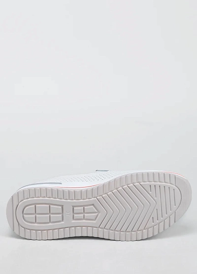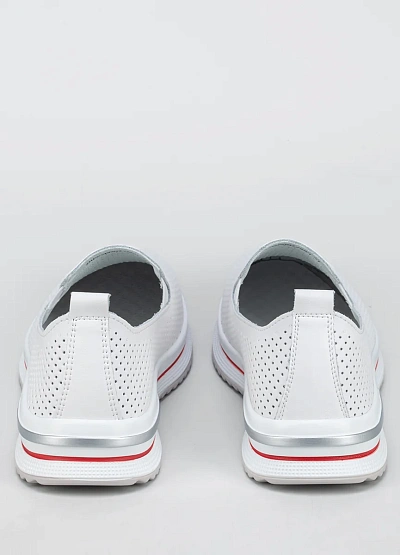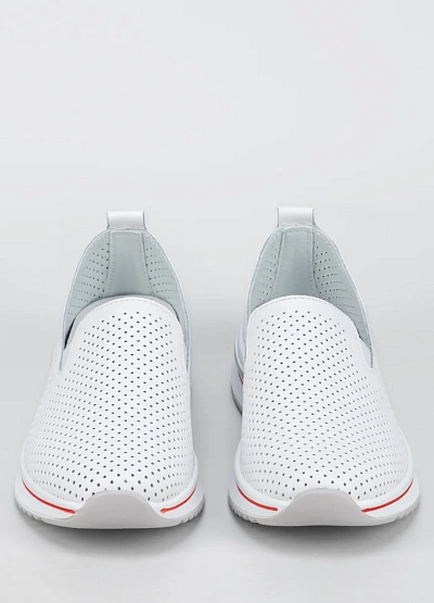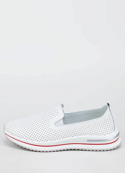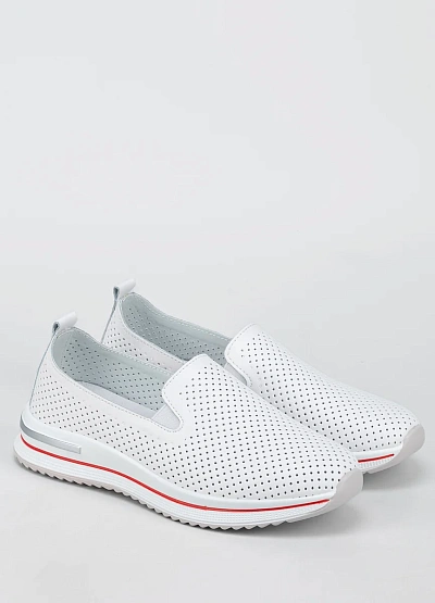 Женские слипоны нейтрального белого цвета с аккуратной перфорацией по всей поверхности. Модель выполнена в светлой цветовой гамме, отличается легким дизайном и гибкой плоской подошвой с декоративной красной полосой.