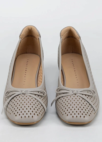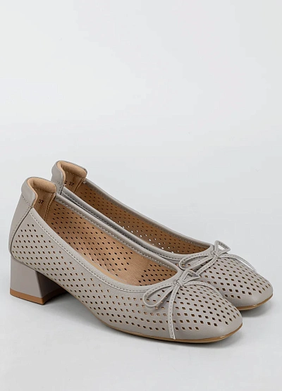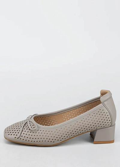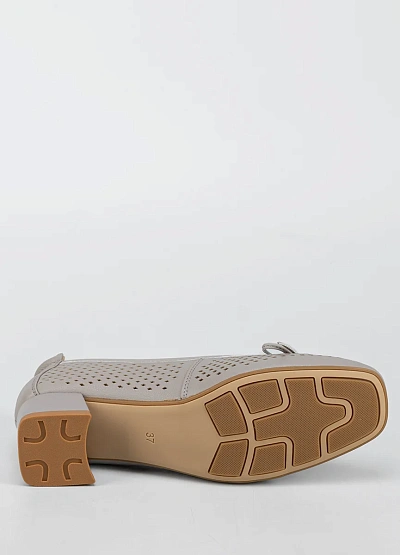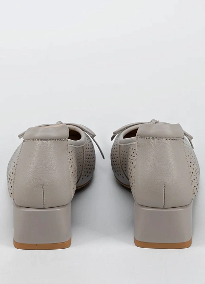 Женские туфли светло-серого цвета с перфорацией и квадратным носком. Модель выполнена в лаконичном стиле с низким устойчивым каблуком и декоративным бантом на мысе, что придаёт образу аккуратность.