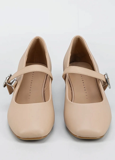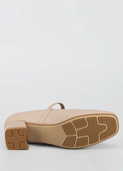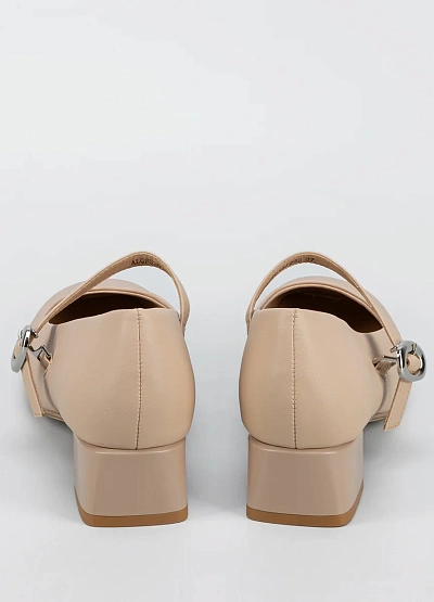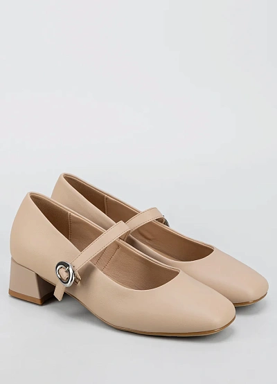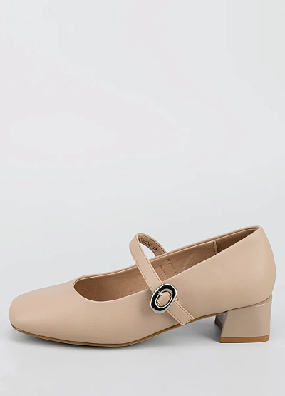 Женские туфли бежевого цвета на среднем каблуке. Модель выполнена в нейтральной цветовой гамме, с закрытым мысом и ремешком с пряжкой через подъем стопы. Отличается лаконичным дизайном и аккуратной формой.