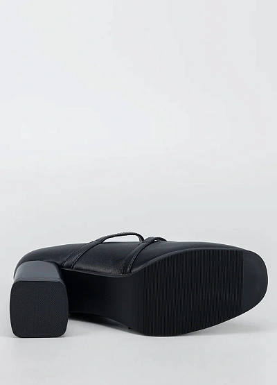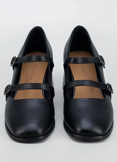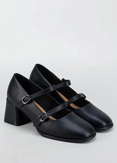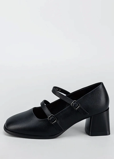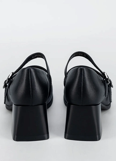 Женские туфли закрытого типа в классической чёрной цветовой гамме. Модель выполнена с двумя ремешками и устойчивым каблуком средней высоты, что придаёт обуви строгий и аккуратный внешний вид.