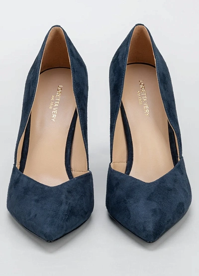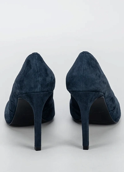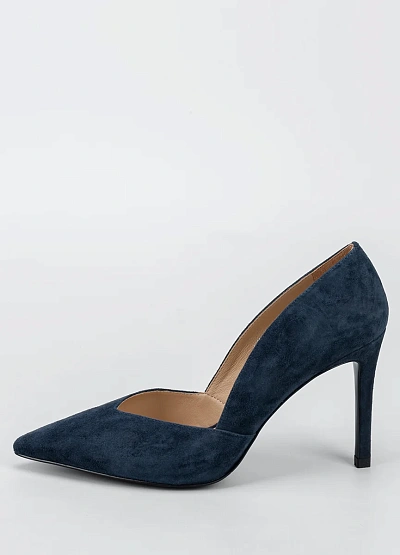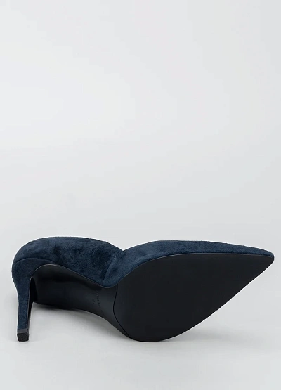 Элегантные женские туфли на высоком каблуке в тёмно-синей цветовой гамме. Модель выполнена с заострённым мысом и глубоким вырезом по бокам, что придаёт обуви классический и сдержанный вид.
