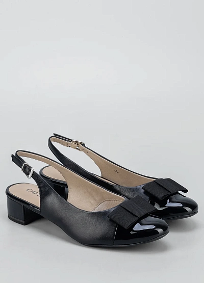 Женсккие туфли слингбэки, представлены в классической черно-бежевой цветовой гамме. Модель украшена бантом на носке, имеет открытую пятку и регулируемый ремешок на щиколотке, а также низкий устойчивый каблук.