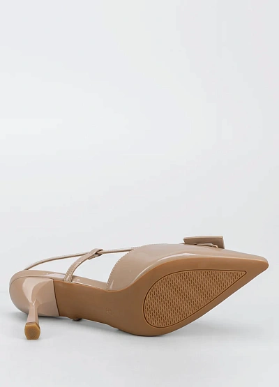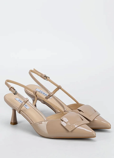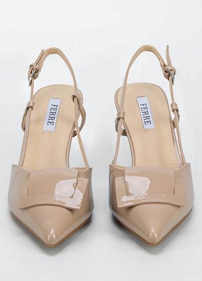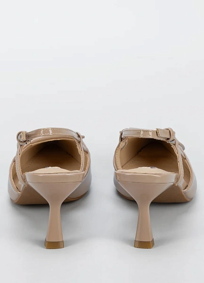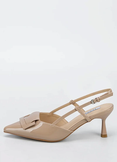 Женская модельная обувь в виде туфель бежевого цвета. Обувь имеет острый носок, аккуратный невысокий каблук и декорирована широкой пряжкой спереди, а также тонкими ремешками с пряжкой на щиколотке. Цветовая гамма — светло-бежевые, нейтральные оттенки с глянцевым финишем.