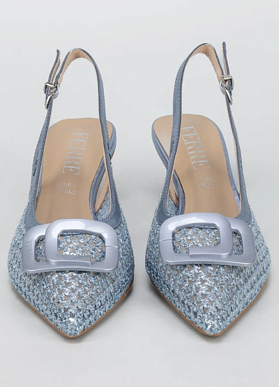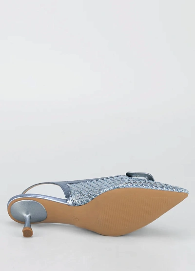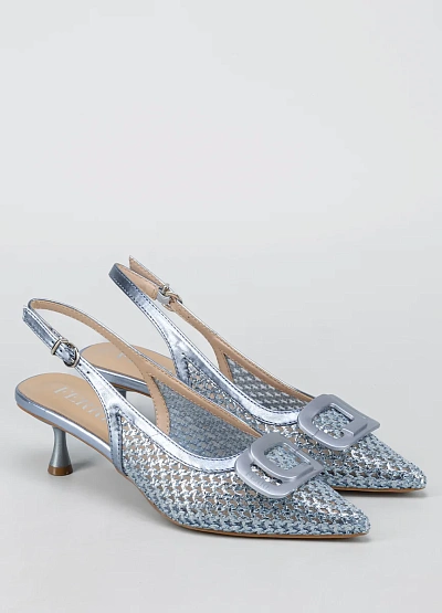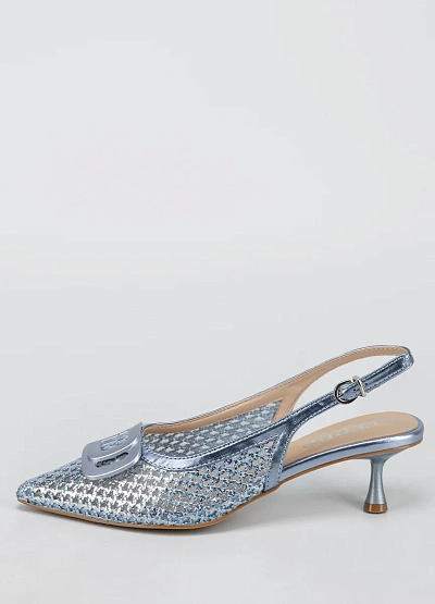 Женские элегантные туфли слингбэки с ремешком на пятке в серебристо-голубой цветовой гамме. Модель имеет заострённый носок, небольшой устойчивый каблук и декоративный элемент в виде крупной пряжки на мысе.