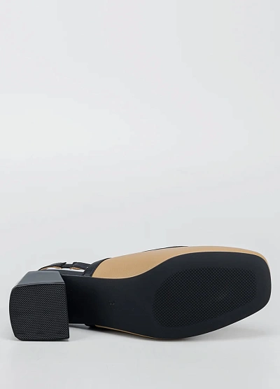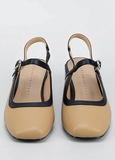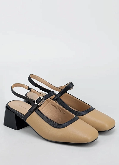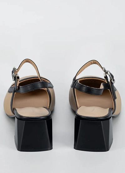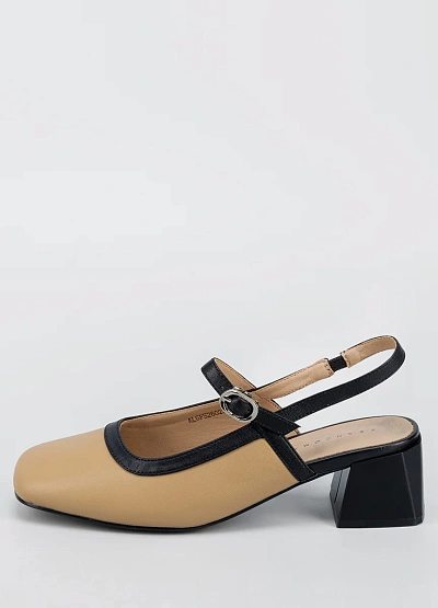 Женские туфли слингбэки закрытого типа с ремешком, выполненная в бежево-черной цветовой гамме. Модель отличается квадратным носком, средней высоты каблуком и контрастной отделкой по краю.