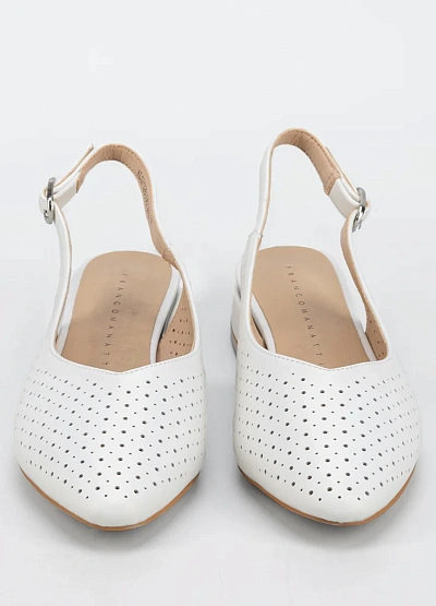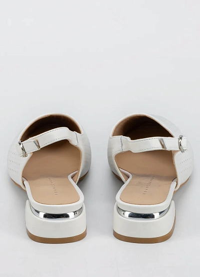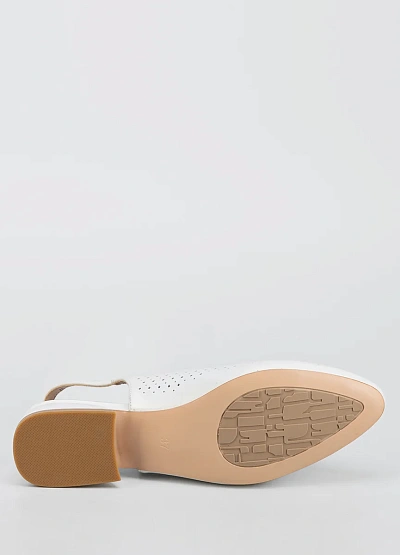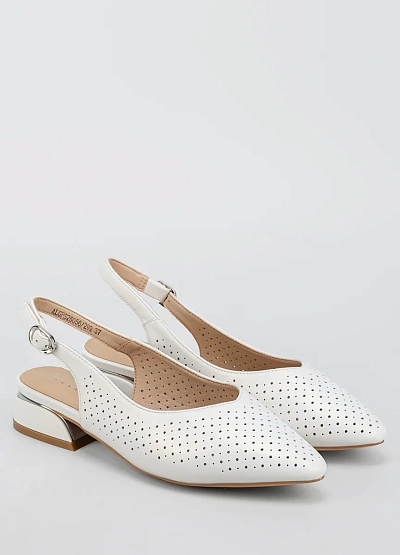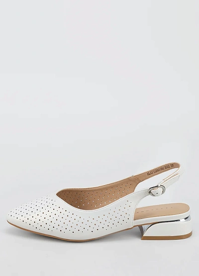 Женские туфли слингбэки белого цвета с перфорацией и низким каблуком. Модель выполнена в светлой цветовой гамме, имеет заострённый носок и ремешок на пятке с металлической пряжкой.