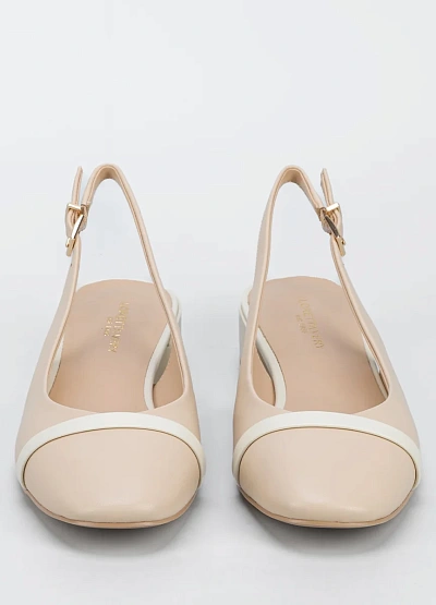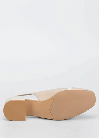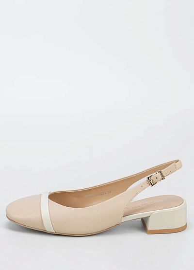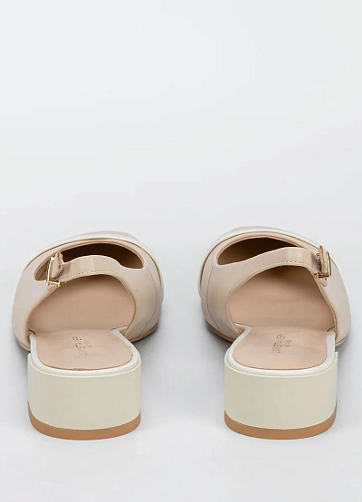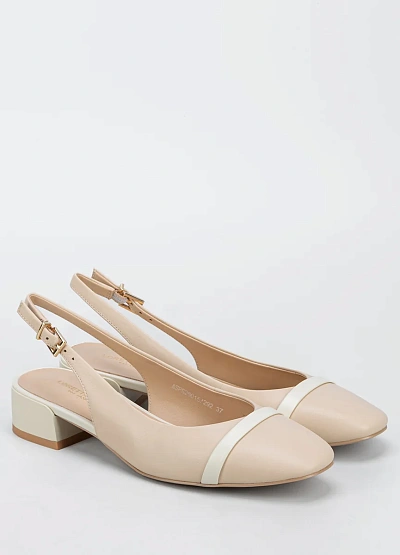 Женские туфли слингбэки с открытой пяткой в светлой бежево-молочной гамме. Модель имеет квадратный устойчивый каблук, ремешок с пряжкой и контрастную деталь на носке. Смотрится лаконично и сдержанно.