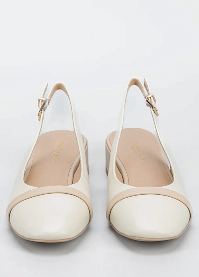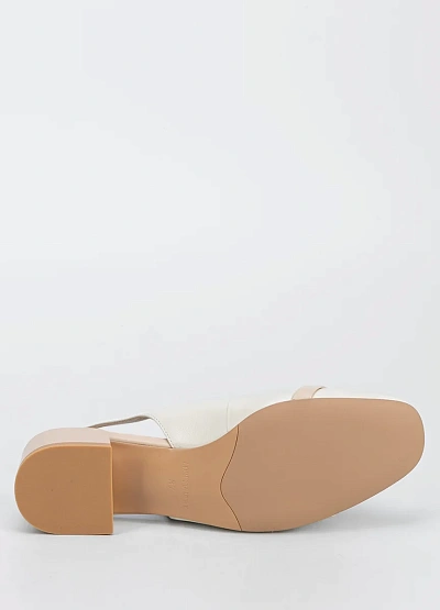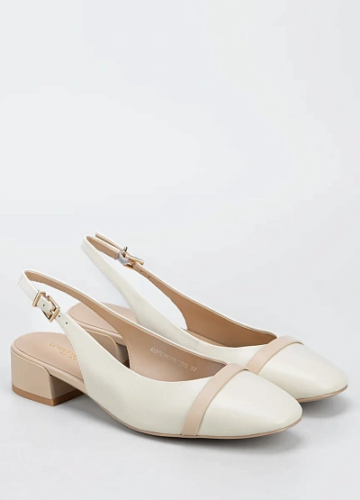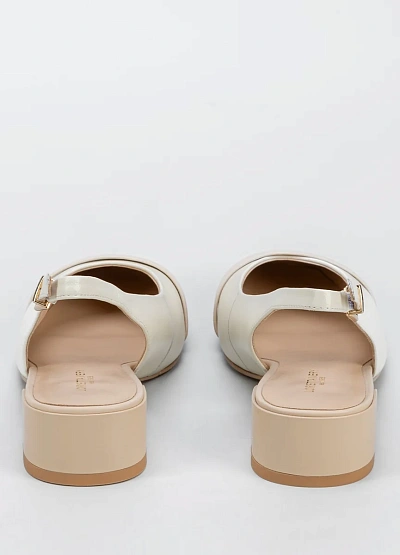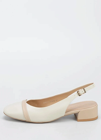 Женские туфли слингбэки светлых оттенков с открытой пяткой и невысоким каблуком. Модель выполнена в бежево-молочной цветовой гамме, дополнена ремешком с пряжкой на щиколотке и контрастной полоской на носке.