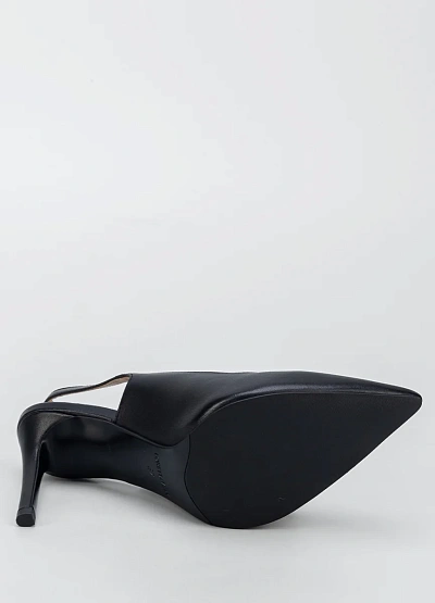 Женские туфли слингбэки на высоком каблуке черного цвета. Модель с заостренным носком и открытой пяткой, дополнена ремешком с пряжкой. Стильный и лаконичный дизайн делает изделие универсальным для разных образов.