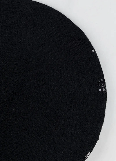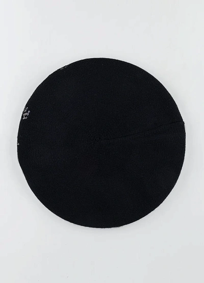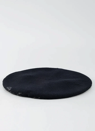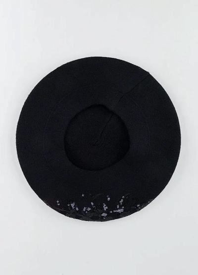 Женский берет тёмного цвета с лаконичным дизайном. Модель выполнена в чёрной цветовой гамме, с едва заметными декоративными элементами по краю. Изделие отличается классической округлой формой без дополнительных деталей.