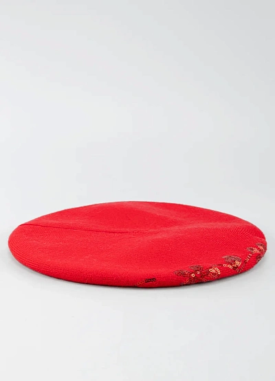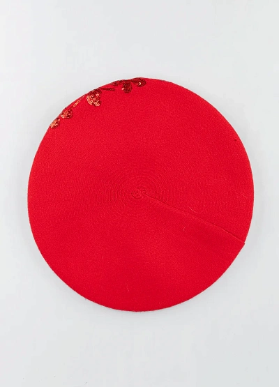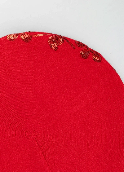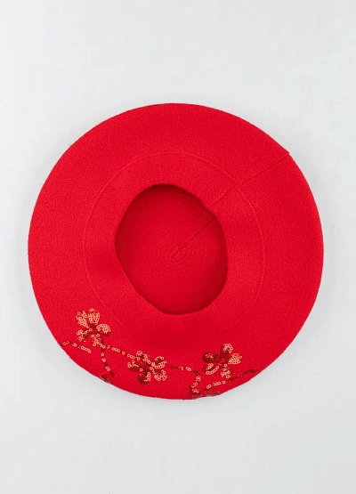 Женский берет выполнен в насыщенном красном цвете. Модель отличается лаконичным дизайном с декором из пайеток в области края, что придает аксессуару интересный акцент.