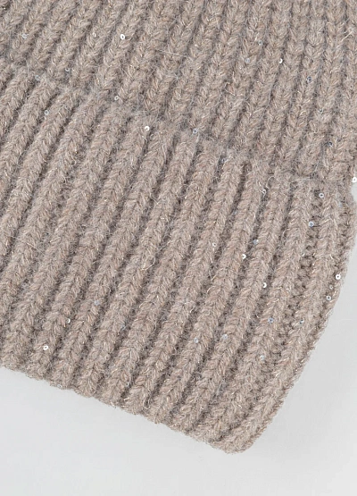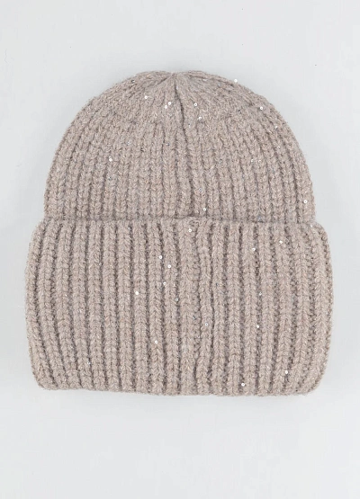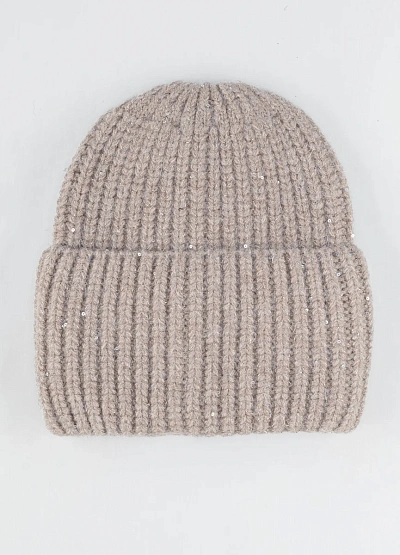 Женская вязаная шапка нейтрального бежевого цвета выполнена в объёмной резинке. Модель украшена мелкими пайетками, что придаёт изделию лёгкий блеск и акцент.