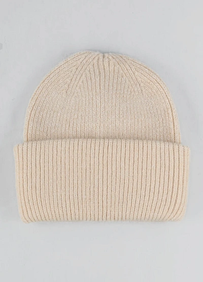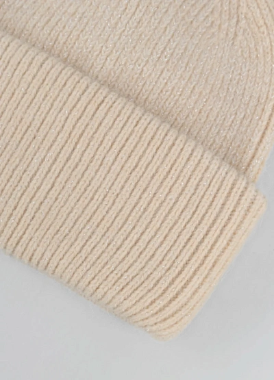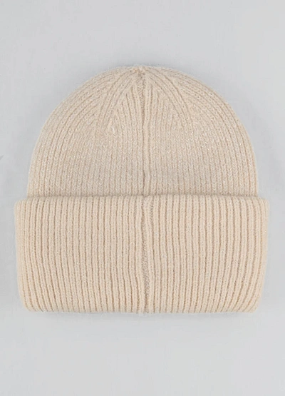 Женская вязаная шапка в светлой цветовой гамме. Изделие выполнено в кремовом оттенке, имеет отворот и выразительный фактурный узор. На поверхности видна мелкая люрексовая нить, добавляющая легкое сияние.