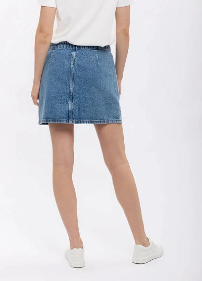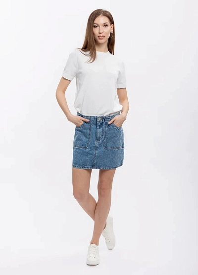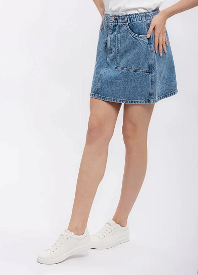 Женская юбка мини голубого цвета выполнена в классическом стиле с двумя крупными накладными карманами спереди. Модель отличается прямым силуэтом и аккуратной фирменной отделкой по краям.