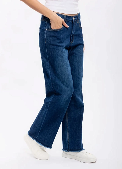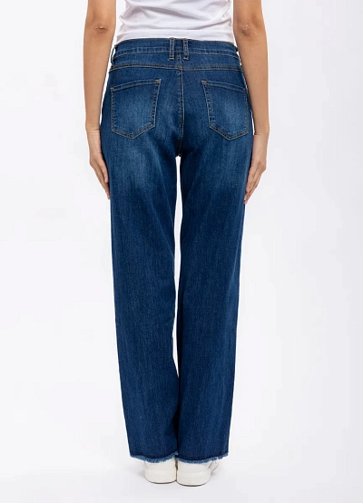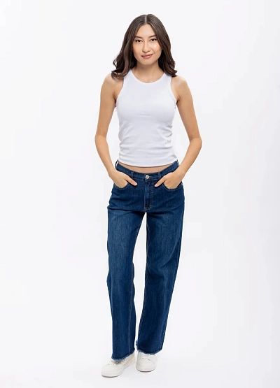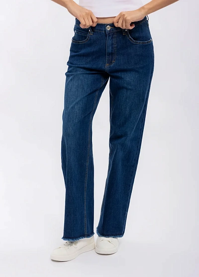 Женские прямые джинсы тёмно-синего цвета. Классическая модель на средней посадке с застёжкой на пуговицу и молнию. Низ брючин оформлен необработанным краем, что придаёт стильный акцент.
