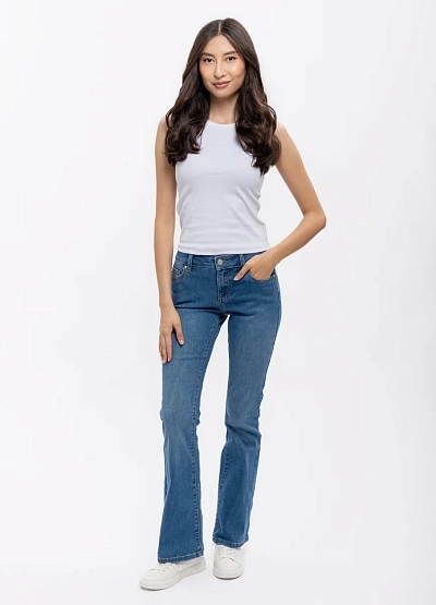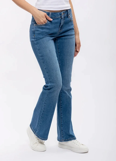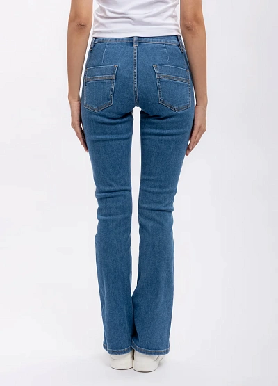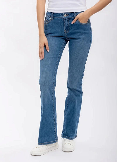Женские джинсы классического кроя в синей цветовой гамме. Модель обладает средней посадкой и прямыми слегка расклешёнными штанинами. Видны стандартные карманы и шлёвки для ремня.